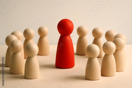 One Red Figure Standing Out Among a Group of Wooden Figures – Representing Individuality and Leadership