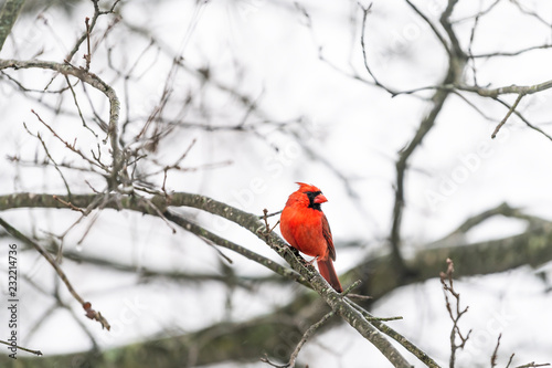 One red northern cardinal bird, Cardinalis, perched on tree branch during cold winter colorful in Virginia looking back, front crest