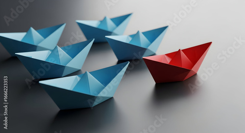 One red paper boat leads a fleet of blue boats, symbolizing leadership, innovation, and standing out from the crowd in a competitive business environment.