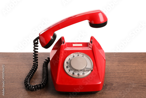 One red telephone with handset on wooden table against white background