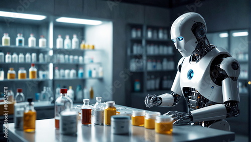 One Robot in a medicine laboratory developing and researching on new herbal and organic medicines.