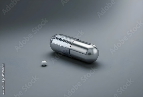 One silver capsule with glossy texture on a muted grey backdrop, minimalist luxury supplement style.