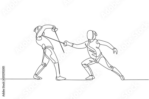 One single line drawing of two young women fencer athlete in fencing costume exercise duel on sport arena vector illustration. Combative and fighting sport concept. Modern continuous line draw design