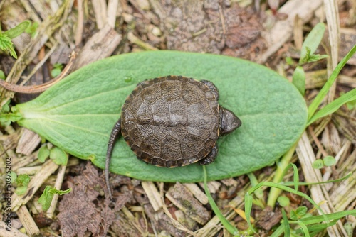 one small brown baby turtle sits on a green leaf of a plant among the grass in nature