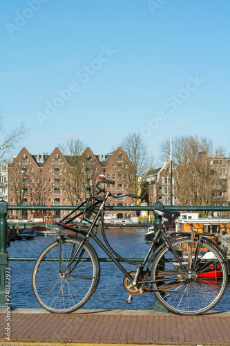One usual black bike near the canal in the center of Amsterdam in the sunny autumn day