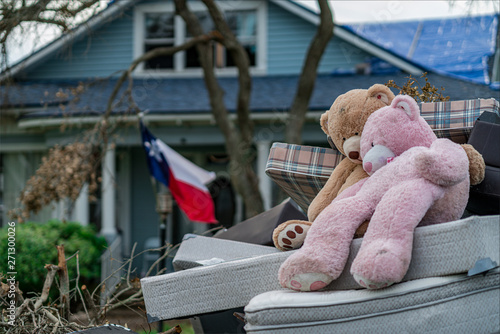 One Week After Hurricane Harvey in Front of destroyed home two teddy bears hold each other