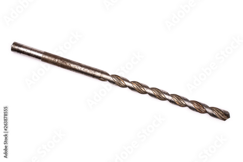 One whole metal drill work item flatlay isolated on white background