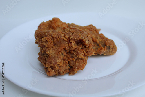 One wing crispy fried chicken, on white plate, isolated in white background, side view