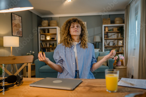 one woman adult caucasian work on her laptop at home meditation relax