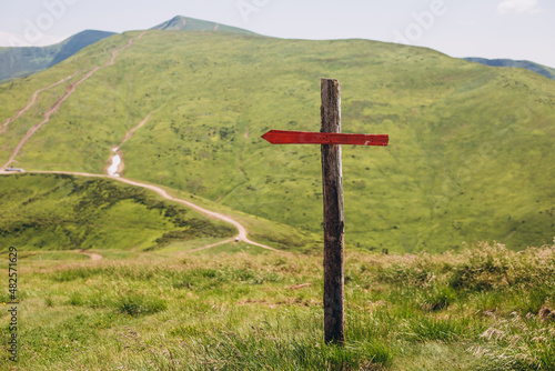 One wooden red signpost in the summer mountain with copyspace. Conceptual leading indicator. Old Arrow on the wooden signpost pointing to a direction.