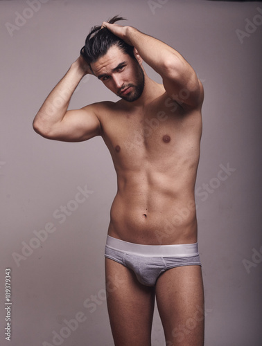 one young handsome man, looking at camera, shirtless, fashion model, gray background wearing briefs.