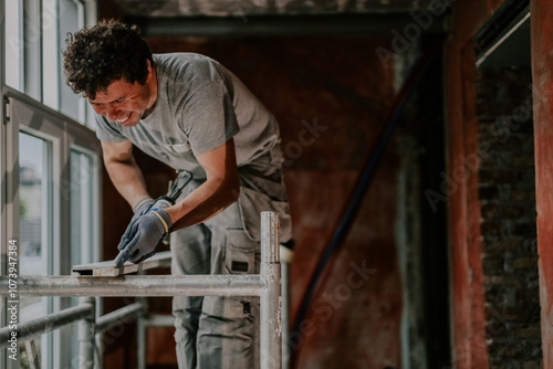 One young man is repairing a window frame.