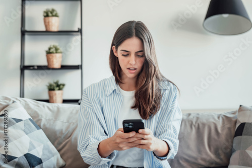 One young stressed woman trying to use internet on phone, having cyber problems at home sitting on couch, holding her phone. Brunette girl frustrated for cellphone not working