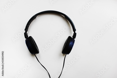 On-ear headphones isolated on light grey background. Black color old wired over-ear headphones, music listening device close up top view with empty copy space for text and advertising