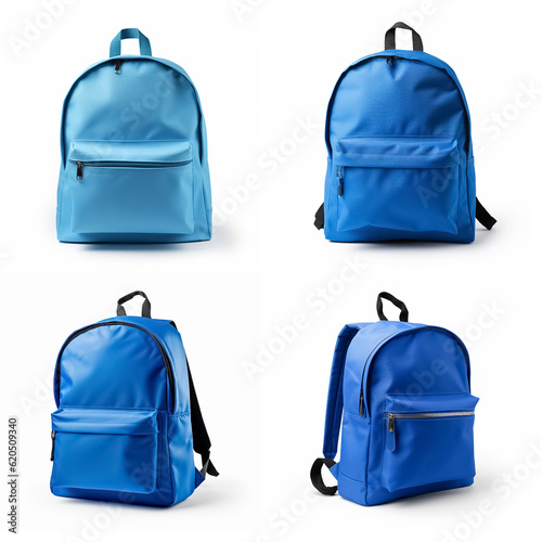 One-color school backpack on a white background. School backpack mockup. A set of blue backpacks.