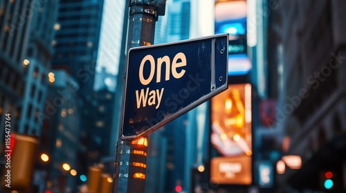 One-way street sign in a city at night.