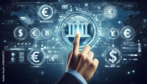 Online banking and digital money concept with man finger on virtual touch screen interface with central bank layout surrounded currency signs: dollar, euro, ruble and yen on abstract background