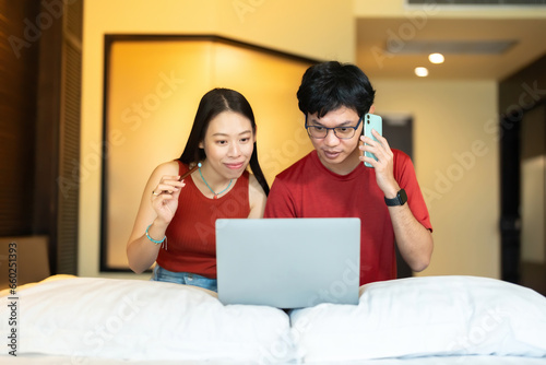 Online business owner Asian men and women Using a smartphone holding a pen and looking at a laptop, working together and checking orders for company products. wearing a red shirt In the hotel bedroom