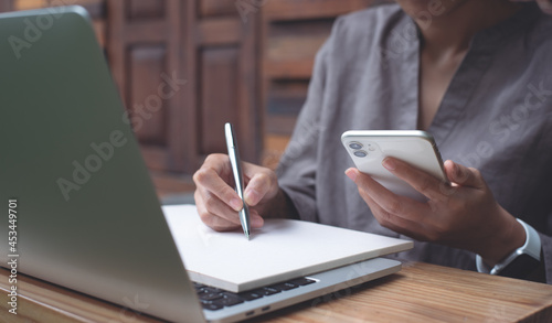 Online class, Student writing on notebook while study at home, Adult woman doing online lesson by using mobile phone and laptop computer