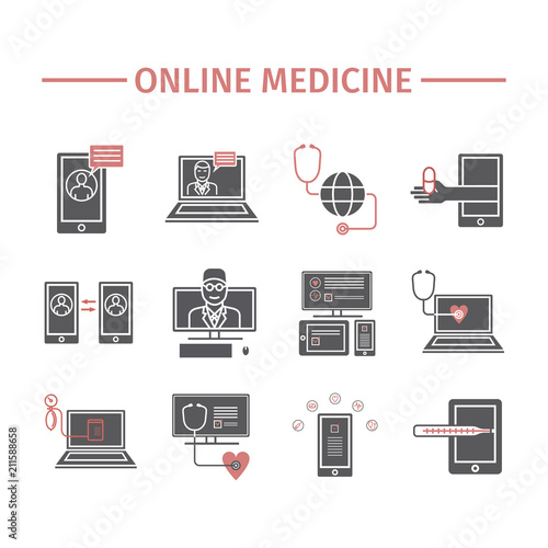 Online diagnosis and treatment. Virtual medical consultation infographic. Vector line icons. infographic set.