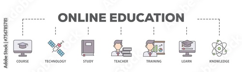 Online education banner web icon illustration concept with icon of course, technology, study, teacher, training, learn and knowledge icon live stroke and easy to edit