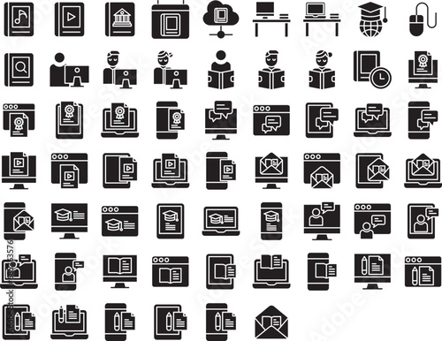 Online education learning solid glyph icons set, including icons such as Audio Book, Book, Cloud Book, Desk,, and more. Vector icon collection