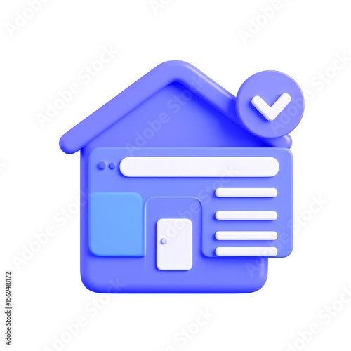 Online Home Security: A captivating 3D rendering of a house, enhanced with a checkmark and interface, symbolizing secure online accessibility and peace of mind for the home.