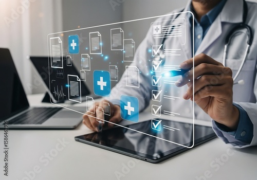 Online medical checklist and documentation system in use by doctor, concept of smart healthcare. physician assessment expert checks patient care quality, hospital assessment of treatment