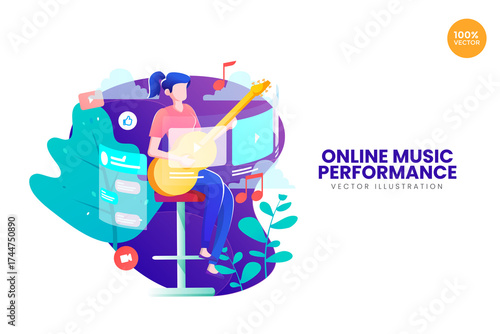 Online Music Performance Vector Illustration with Woman Playing String Instrument on Stool Surrounded by Plants and Screens Against White Background