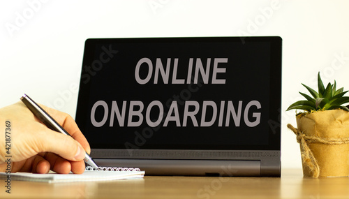 Online onboarding symbol. Tablet with words 'online onboarding'. Online business and onboarding during COVID-19 quarantine. Businessman hand, pen, house plant. Copy space. Online onboarding concept.