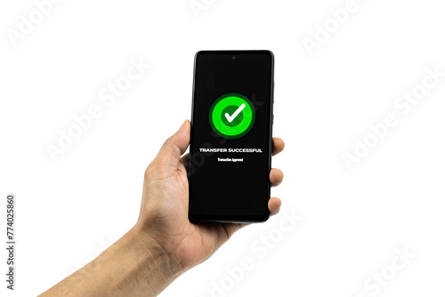 Online payment Concepts. Smartphone with Transfer Successful notification on screen isolated on white background. All screen graphics are made up.