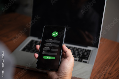 Online payment confirmation on mobile. Digital transaction, e-commerce, fintech, and contactless payment concept. Secure mobile banking and financial technology for fast and safe purchases.