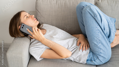 Online pharmacy. Sick woman. Stomach disease. Ill lady calling mobile phone making order of medicines laying sofa light home interior.