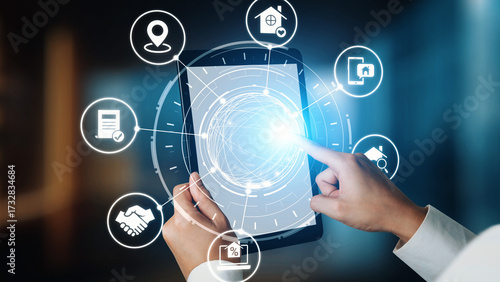 Online property search icons showing real estate rent, sale, housing, location, property management, key, contract, mortgage, home loan, and housing market. Gist