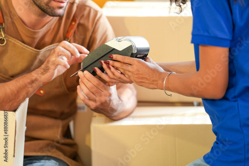 Online sales are staffed by a delivery lady who prepares the shipment by checking the receipt of the product and paying via an online credit card system for shipping to another location.