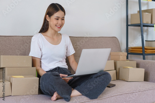 Online selling concept, Asian business woman checking online orders on laptop to prepare delivery