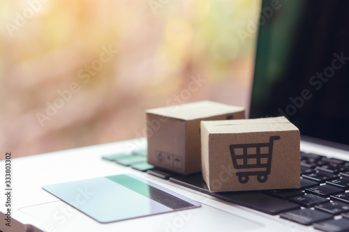 Online shopping - Paper cartons or parcel with a shopping cart logo and credit card on a laptop keyboard. Shopping service on The online web and offers home delivery.