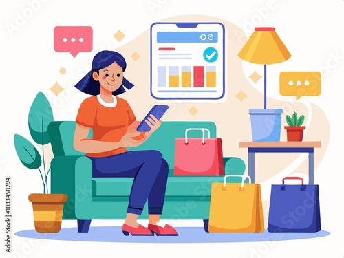Online shopping concept vector illustration in flat cartoon style. Woman with mobile phone and shopping bags sitting on the bench.