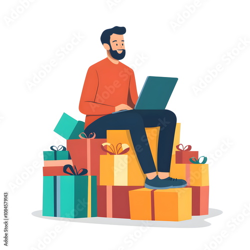 Online shopping on the Internet, ordering and delivery of gifts. Cyber Monday sale, Online stores and virtual shops. Flat illustration. Buyer with a laptop and a bunch of gifts on a white isolated b