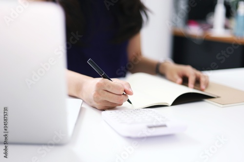 Online studying class for E learning. Smart student girl sitting at table watching lesson online and studying from home. Stay home stay safe