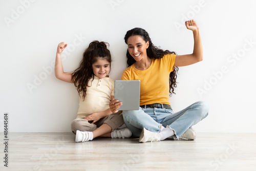 Online Success. Arab Mother And Little Daughter With Digital Tablet Celebrating Win