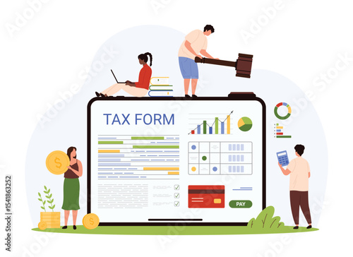 Online tax form filling and payment guide. Tiny people pay for electronic statement on tablet screen, plan accounting for tax expenses and audit in digital bank account cartoon vector illustration
