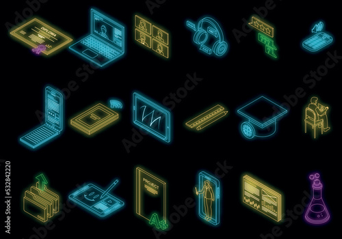 Online training icons set. Isometric set of online training vector icons neon color on black