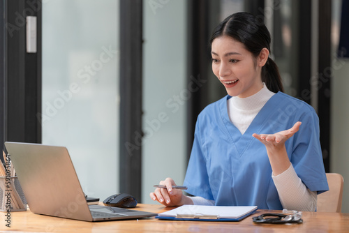 Online video conference chat with Asian female doctor and patient while discussing and diagnosing on laptop and looking at camera.