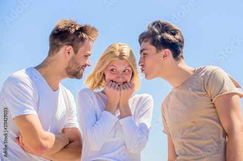 Only love can warm us. summer vacation. time to relax. group of people outdoor. heaven. success heights. happy woman and two men. cheerful friends. friendship relations. family bonding and love