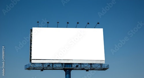 澄んだ青空を背景にした看板のローアングルビュー。広告。OOH|Low angle view of a billboard against a clear blue sky. Advertising. OOH.
