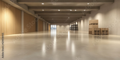 Open and spacious warehouse interior with wooden accents and storage areas