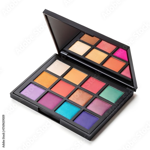 Open black eyeshadow palette with sixteen colorful matte and shimmer shades on white background makeup