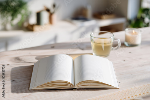 Open blank planner notebook on a table with a cup of tea and candles. Concept: the beginning of the school year, self-reflection in the diary, cozy home office, distance learning. Education.