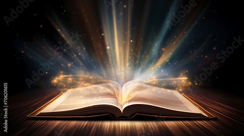 Open book Bible on wooden desk with mystic bright light fantasy light like holy spirit on black bokeh background magic poster